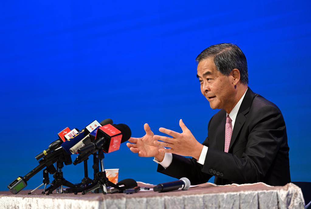 Leung Chun-ying, former chief executive of the Hong Kong Special Administrative Region (HKSAR), also vice chairman of the National Committee of the Chinese People's Political Consultative Conference, speaks to the press in south China's Hong Kong, June 6, 2022.