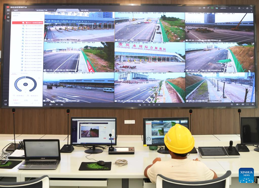 A staff member operates monitoring system of the Chongqing Yongchuan Comprehensive Bonded Zone in southwest China's Chongqing Municipality, June 21, 2022.