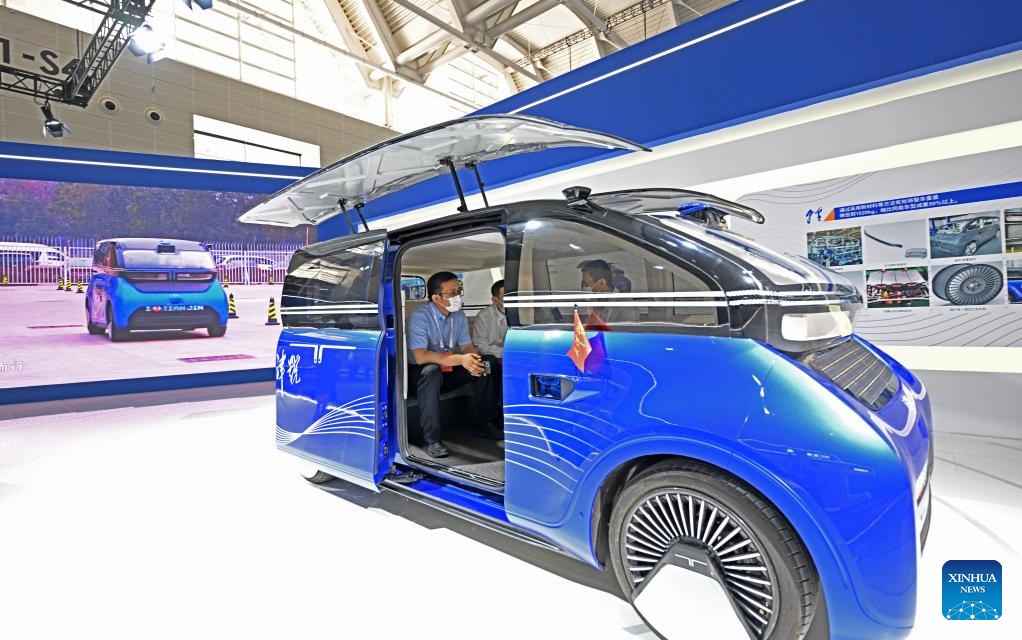 Participants try a solar-powered car during an exhibition of the 6th World Intelligence Congress in north China's Tianjin, June 24, 2022. (Xinhua/Zhao Zishuo)