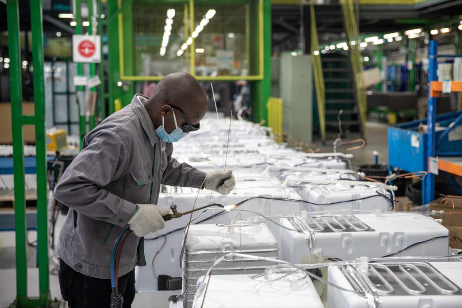 A worker operates on the refrigerator production line at Hisense South Africa Industrial Park in Cape Town, South Africa, June 1, 2022. Hisense is a Chinese consumer electronics company. (Xinhua/Lyv Tianran)