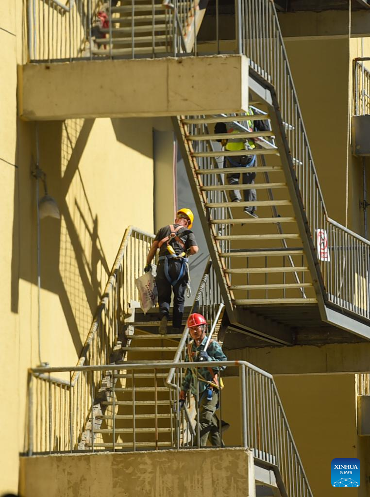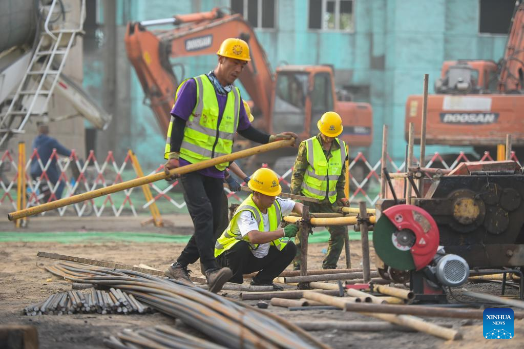 Constructors work at a construction site in Baotou, north China's Inner Mongolia Autonomous Region, June 24, 2022.
