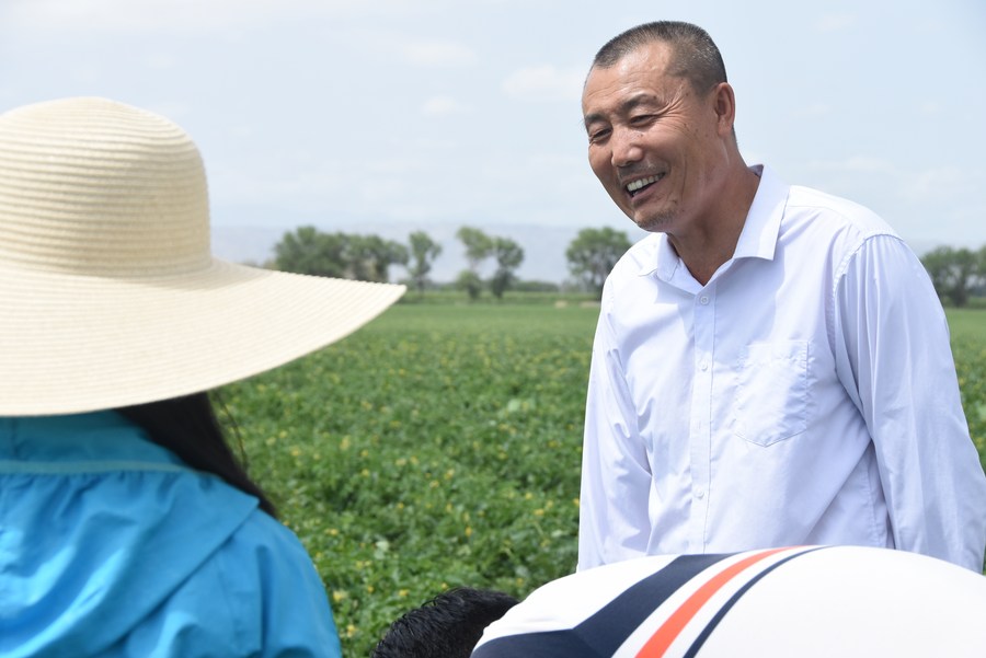 Bai Jingui talks with agricultural technicians in the fields at a tomato farm in Xingfu Village in the Hui Autonomous Prefecture of Changji, northwest China's Xinjiang Uygur Autonomous Region, June 15, 2022. (Xinhua/Zhang Xiaolong)