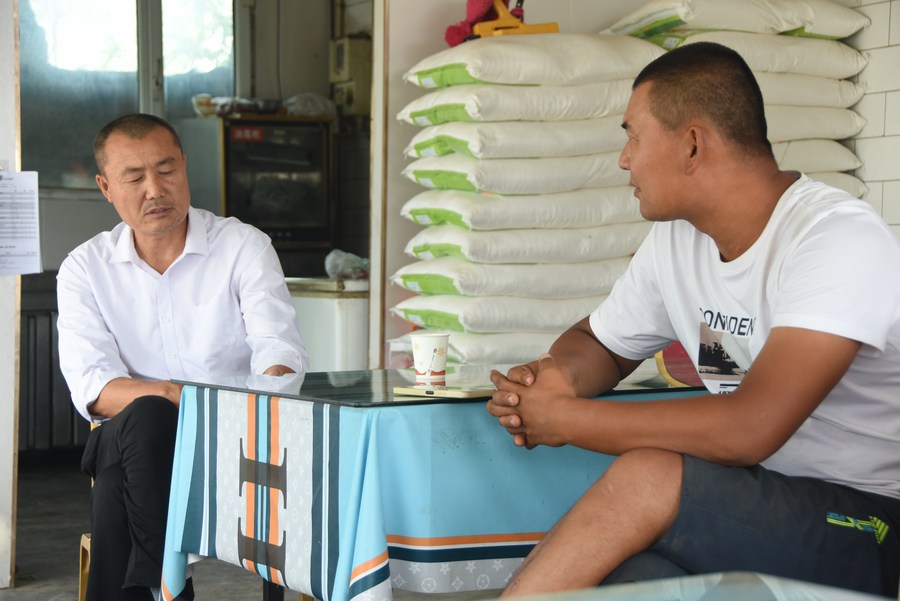 Bai Jingui (L) talks with his son Bai Yang at home in Xingfu Village in the Hui Autonomous Prefecture of Changji, northwest China's Xinjiang Uygur Autonomous Region, June 15, 2022. (Xinhua/Zhang Xiaolong)