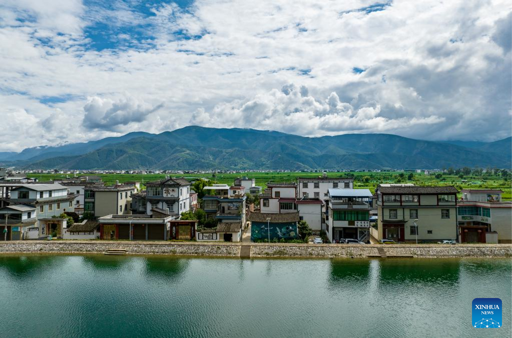 Aerial photo taken on June 24, 2022 shows Liu Zhicheng working on a wall painting in Sanchuan Township, Yongsheng County, Lijiang City, southwest China's Yunnan Province.