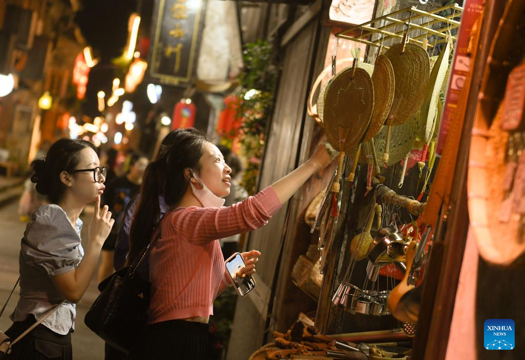 Tourists select products of straw weaving, an intangible cultural heritage, in the ancient city of Taizhou, Linhai, east China's Zhejiang Province, June 23, 2022.