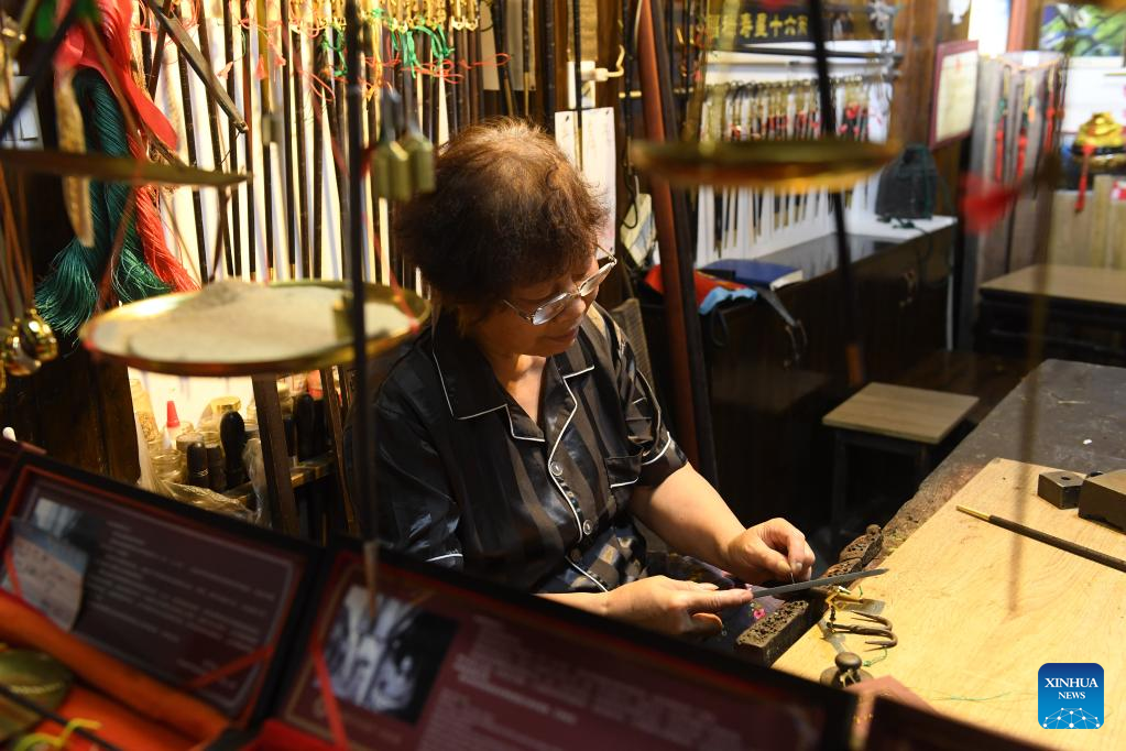 An inheritor of the intangible cultural heritage of steelyard making works at her atelier in the ancient city of Taizhou, Linhai, east China's Zhejiang Province, June 23, 2022.