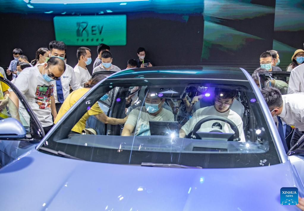 Visitors view a new energy vehicle during the 2022 Chongqing International Auto Exhibition in southwest China's Chongqing Municipality, June 25, 2022.