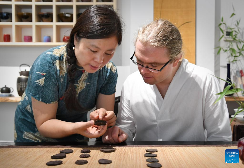 David Mills (R) and Shang Na study tea bricks in Zhengzhou, central China's Henan Province, June 22, 2022.