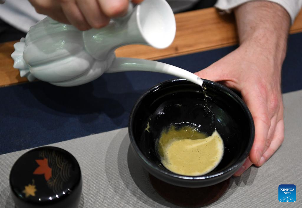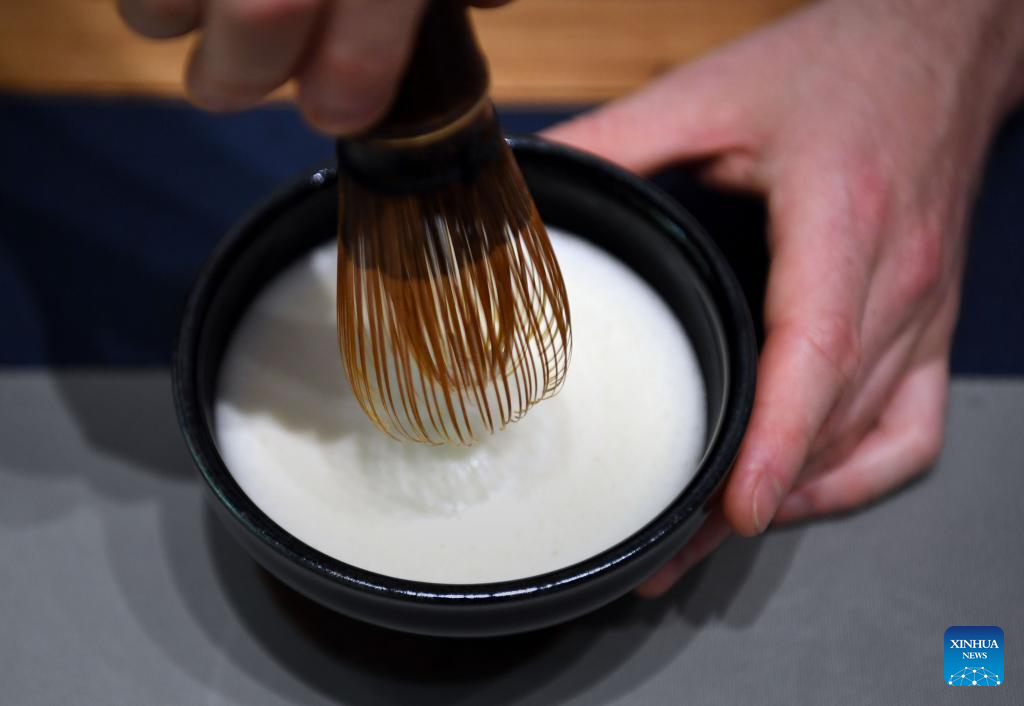 David Mills puts tea powder into a piece of tea ware in Zhengzhou, central China's Henan Province, June 22, 2022.