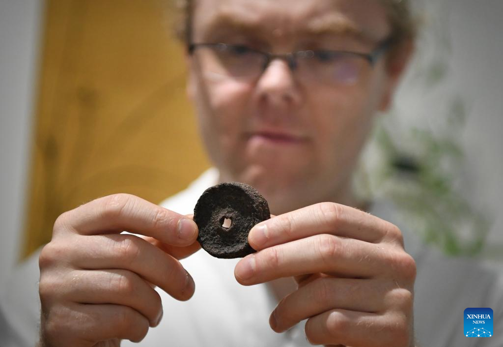 David Mills studies a tea brick in Zhengzhou, central China's Henan Province, June 22, 2022.
