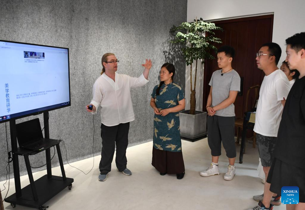 David Mills (1st L) communicates with staff members of a website in Zhengzhou, central China's Henan Province, June 22, 2022.