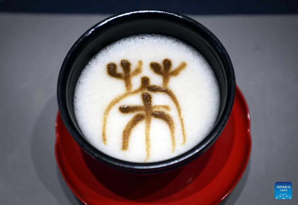 Shang Na writes the Chinese character "cha", which means tea, atop a cup of tea in Zhengzhou, central China's Henan Province, June 22, 2022.