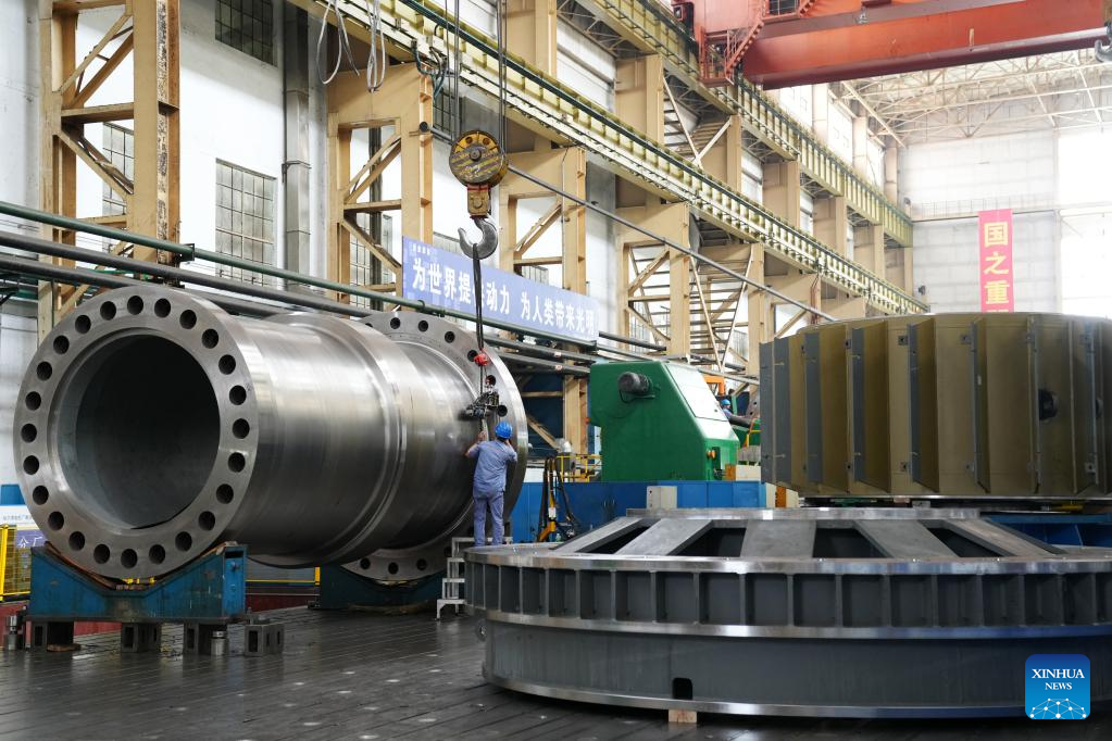 A worker is seen at a workshop at Harbin Electric Machinery Company Limited in Harbin, northeast China's Heilongjiang Province, June 27, 2022. The company maintains stable production under strict COVID-19 prevention and control measures. (Xinhua/Wang Jianwei)