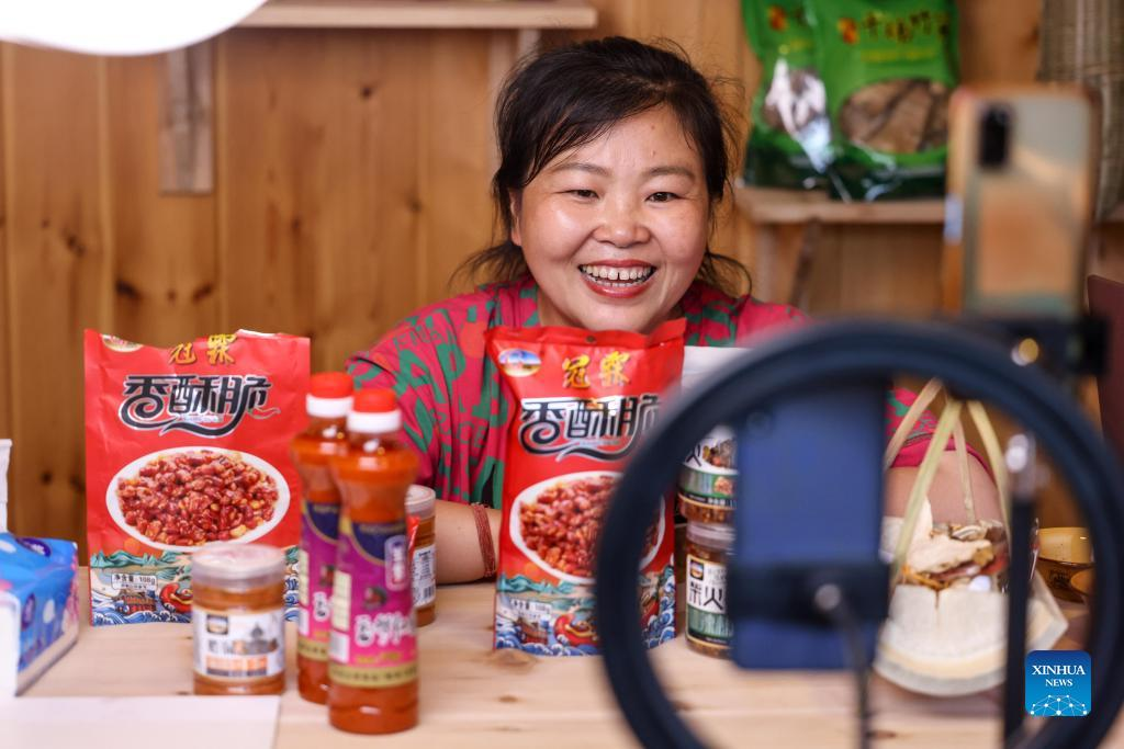 A live streamer of a media company promotes products in Rongjiang County, southwest China's Guizhou Province, June 23, 2022. In recent years new media has played an important role in promoting the rural revitalization projects in Rongjiang County. Local authorities have provided new media skills training service for more than 12,000 people, including inheritors of local intangible cultural heritages, youths returning hometown to start business, relocated residents and local women.