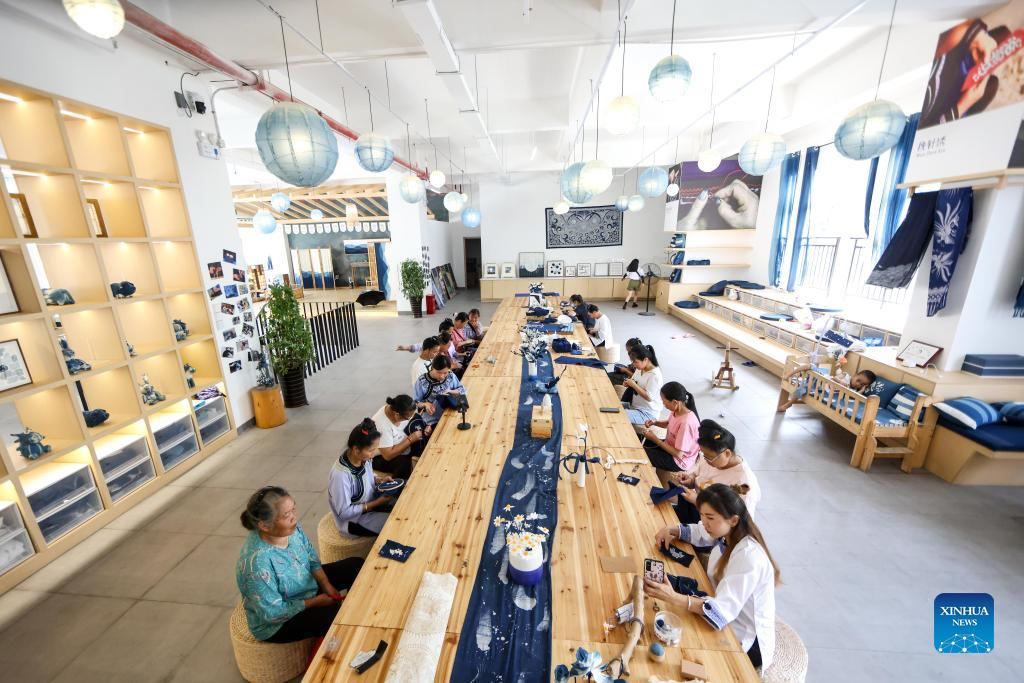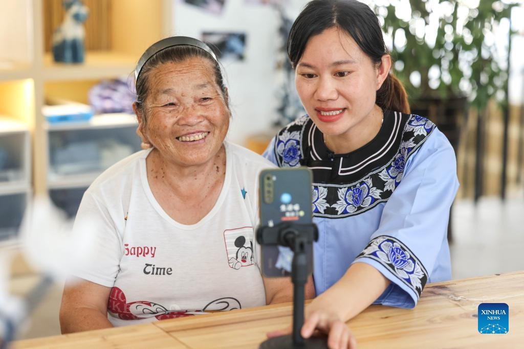 A live streamer displays the embroidery skill of local embroiderers in Rongjiang County, southwest China's Guizhou Province, June 23, 2022. In recent years new media has played an important role in promoting the rural revitalization projects in Rongjiang County. Local authorities have provided new media skills training service for more than 12,000 people, including inheritors of local intangible cultural heritages, youths returning hometown to start business, relocated residents and local women. It is expected that more than 2,000 livestreaming promotion teams will be fostered in Rongjiang by 2023, which will create jobs for more than 10,000 people. (Xinhua/Ou Dongqu)
