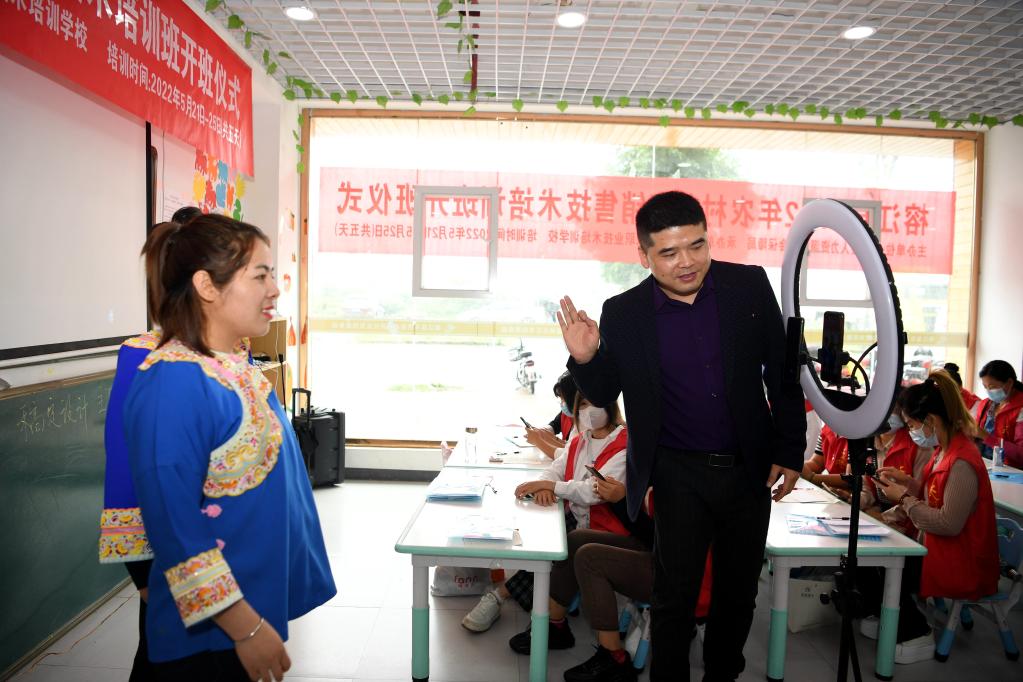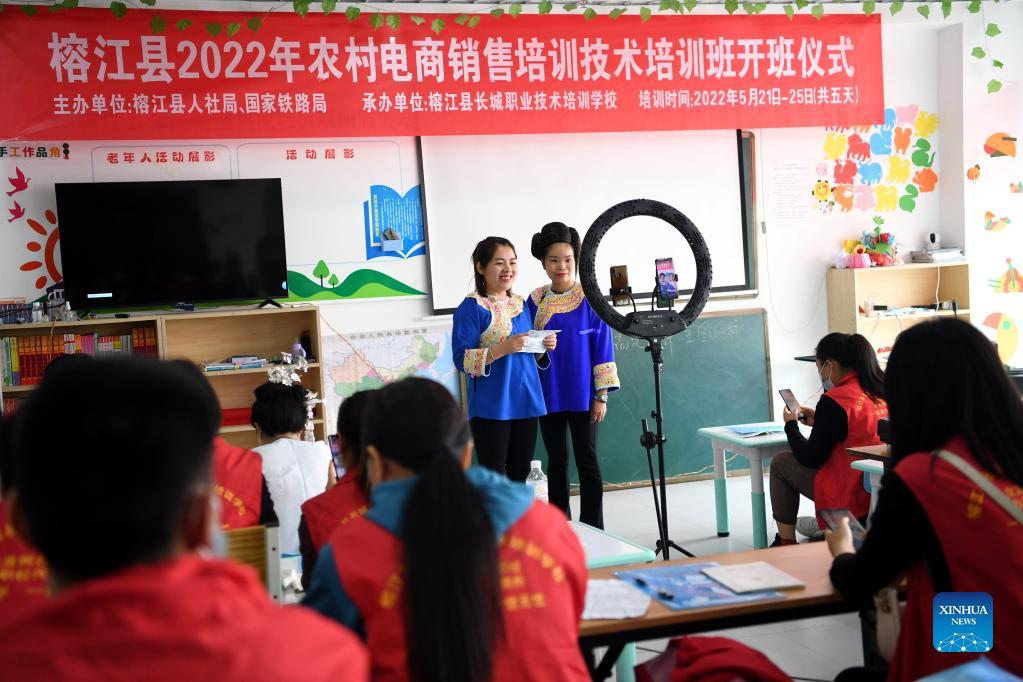 Trainees practice livestreaming promotion skills during an e-commerce training class in Rongjiang County, southwest China's Guizhou Province, May 24, 2022. In recent years new media has played an important role in promoting the rural revitalization projects in Rongjiang County. Local authorities have provided new media skills training service for more than 12,000 people, including inheritors of local intangible cultural heritages, youths returning hometown to start business, relocated residents and local women.