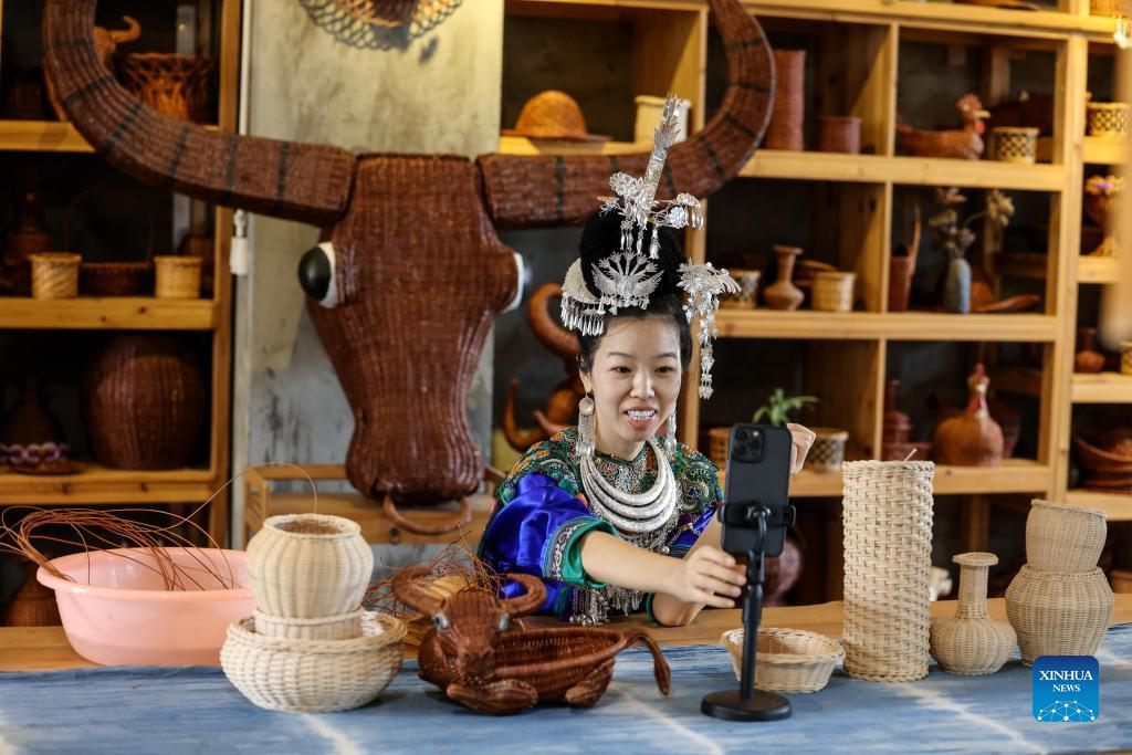 Live streamer Zhang Zhenfei displays the making process of handicraft products made of ferns in Rongjiang County, southwest China's Guizhou Province, June 23, 2022. In recent years new media has played an important role in promoting the rural revitalization projects in Rongjiang County. Local authorities have provided new media skills training service for more than 12,000 people, including inheritors of local intangible cultural heritages, youths returning hometown to start business, relocated residents and local women. It is expected that more than 2,000 livestreaming promotion teams will be fostered in Rongjiang by 2023, which will create jobs for more than 10,000 people. (Xinhua/Ou Dongqu)