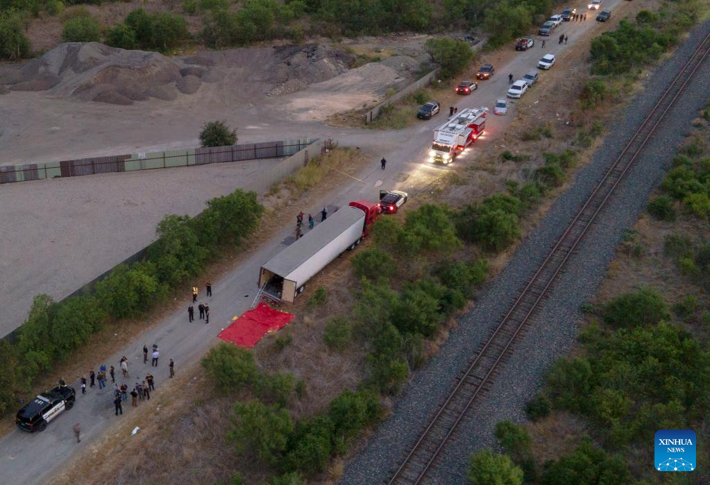 Photo taken on June 27, 2022 shows the scene of an alleged human smuggling mass casualty event in San Antonio, Texas, the United States. The death toll of migrants found on Monday inside a "cloned" and abandoned 18-wheeler in San Antonio has risen to 50, authorities said on Tuesday. (Photo by Nick Wagner/Xinhua)