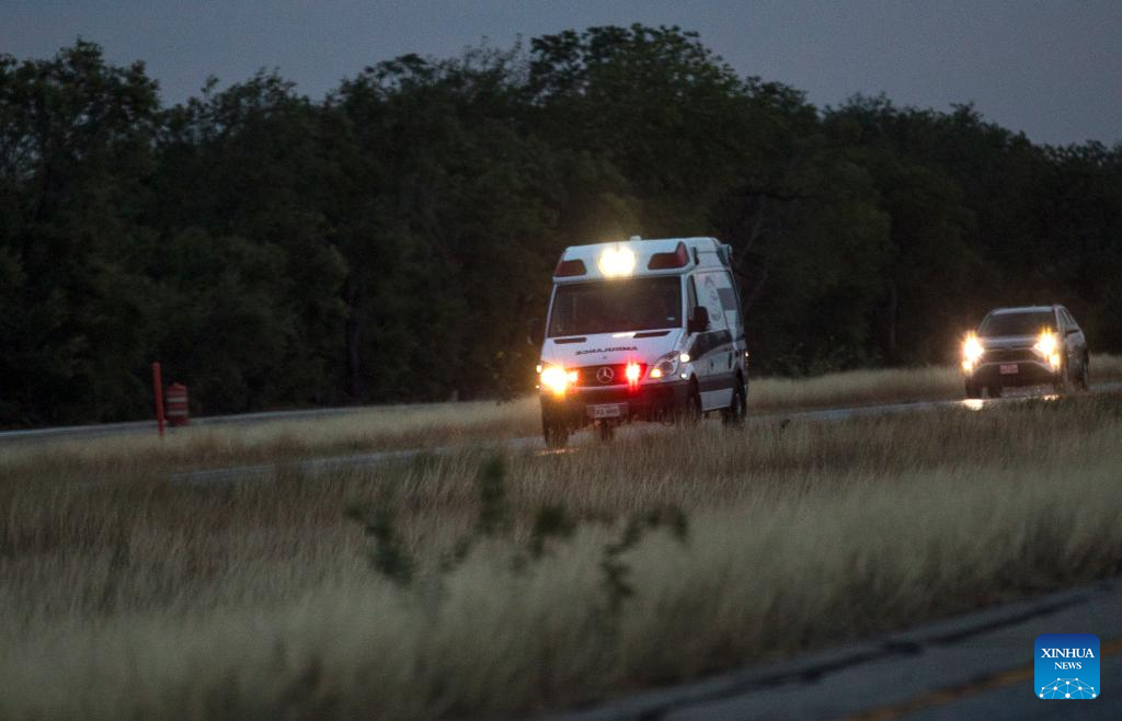 An ambulance leaves the scene of an alleged human smuggling mass casualty event in San Antonio, Texas, the United States, on June 27, 2022. The death toll of migrants found on Monday inside a "cloned" and abandoned 18-wheeler in San Antonio has risen to 50, authorities said on Tuesday. (Photo by Nick Wagner/Xinhua)