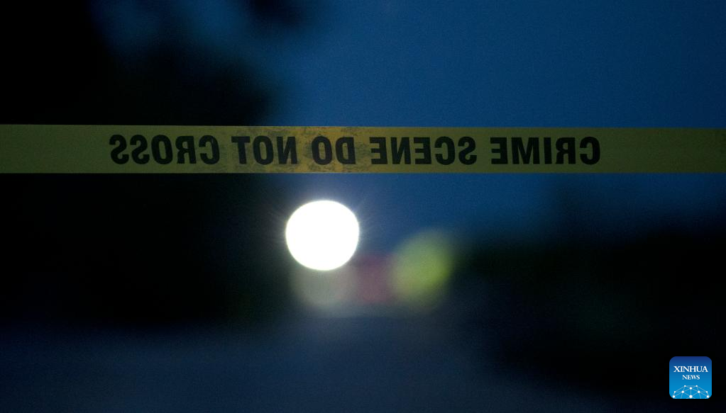 A police officer stands guard around the perimeter of the scene of an alleged human smuggling mass casualty event in San Antonio, Texas, the United States, on June 27, 2022. The death toll of migrants found on Monday inside a "cloned" and abandoned 18-wheeler in San Antonio has risen to 50, authorities said on Tuesday. (Photo by Nick Wagner/Xinhua)