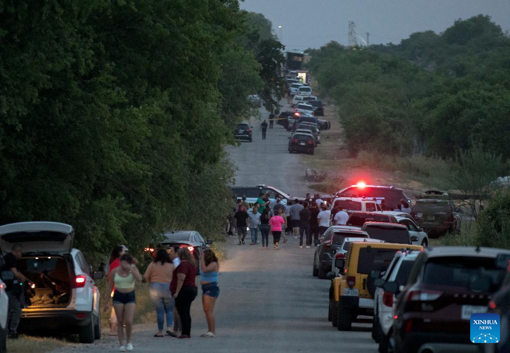 People gather at the scene of an alleged human smuggling mass casualty event in San Antonio, Texas, the United States, on June 27, 2022. The death toll of migrants found on Monday inside a "cloned" and abandoned 18-wheeler in San Antonio has risen to 50, authorities said on Tuesday. (Photo by Nick Wagner/Xinhua)