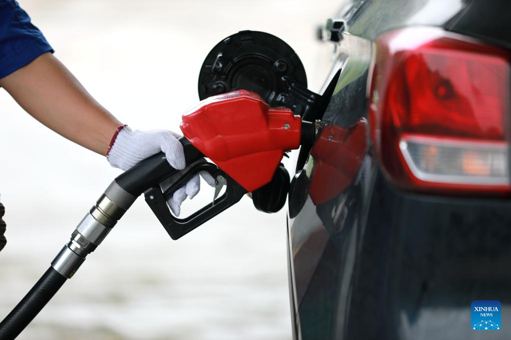 A staff member refuels a vehicle at a gas station in Chengbu Miao Autonomous County of Shaoyang City, central China's Hunan Province, June 28, 2022. (Photo by Yan Qinlong/Xinhua)