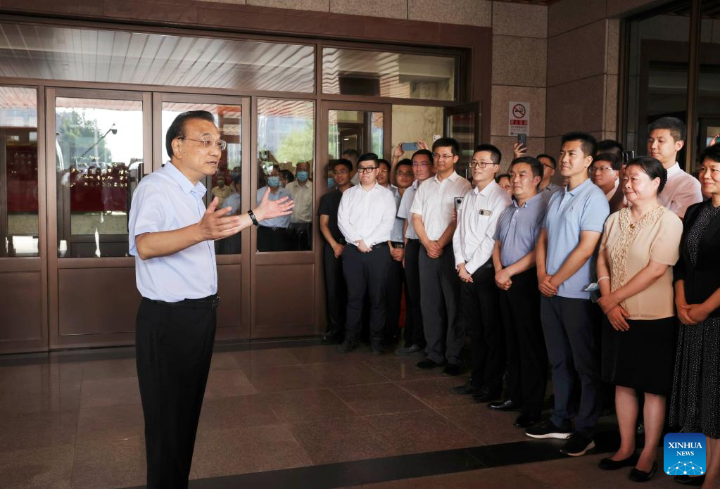 Chinese Premier Li Keqiang, also a member of the Standing Committee of the Political Bureau of the Communist Party of China Central Committee, talks with staff members during an inspection tour to the Ministry of Civil Affairs, June 27, 2022. (Xinhua/Liu Weibing)