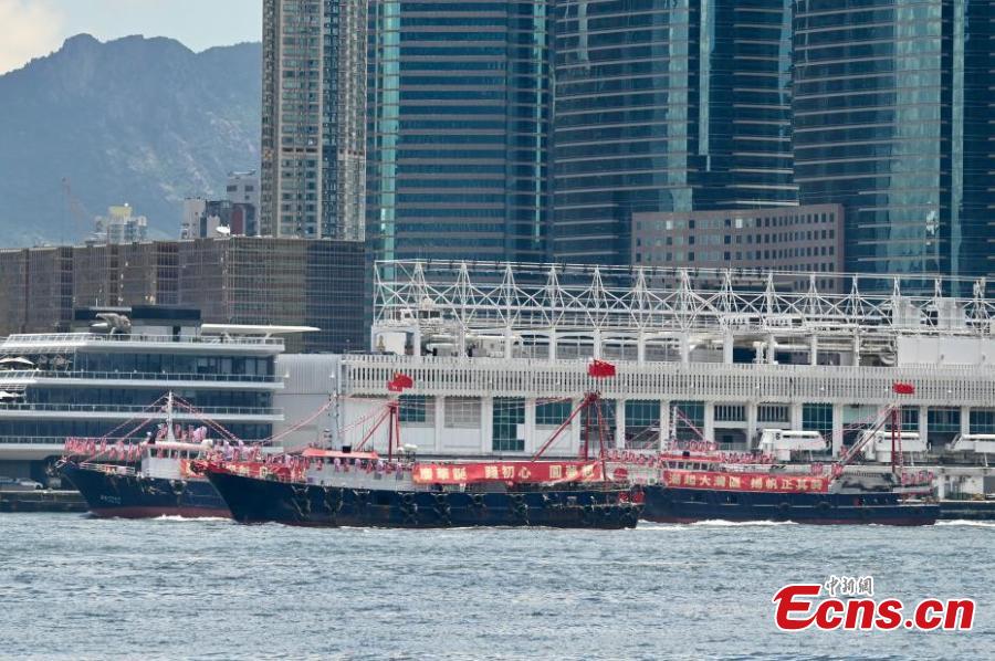 Fishing vessels hanging the Chinese national flags, the Hong Kong Special Administrative Region (HKSAR) flags and celebratory posters sail at the Victoria Harbor in Hong Kong, June 28, 2022. (Photo: China News Service/Li Zhihua)