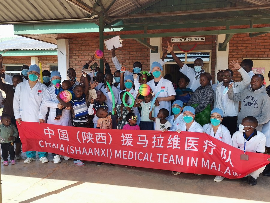 Members of the Chinese Medical Team (CMT) pose with children at the entrance of the paediatric ward of Mzuzu Central Hospital in Mzuzu, Malawi, June 1, 2022. (Chinese Medical Team in Malawi/Handout via Xinhua)