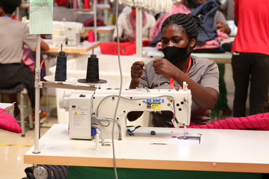 An employee works in Chinese garment factory Pink Mango C&D in Kigali, Rwanda, Jan. 28, 2022. (Photo by Huang Wanqing/Xinhua)