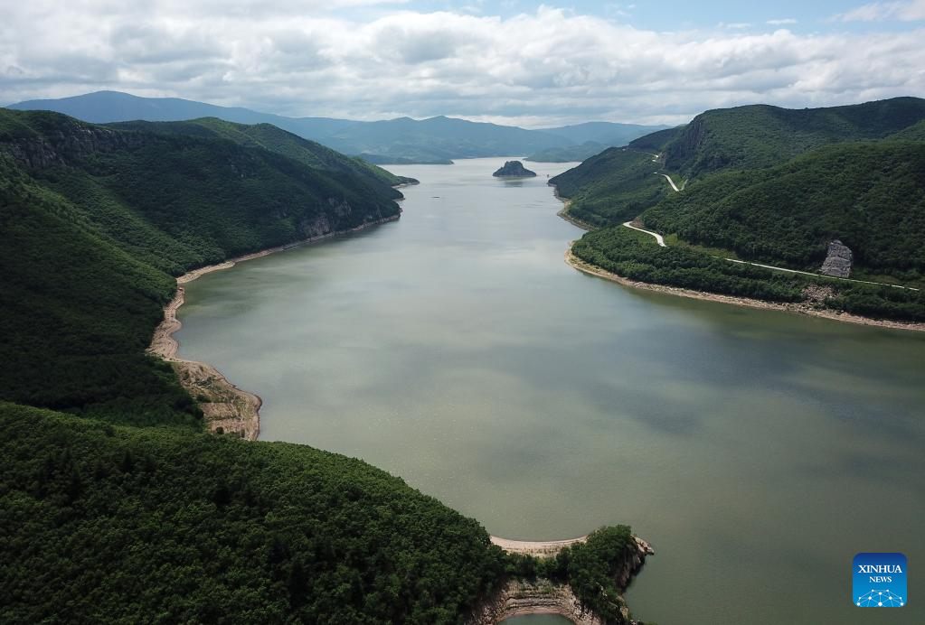 Aerial photo taken on June 29, 2022 shows the reservoir of the Huanggou pumped-storage hydropower station in Hailin City of Mudanjiang, northeast China's Heilongjiang Province. Huanggou power station, the pumped-storage hydropower station with the highest latitude in China, was put into full operation on Wednesday. The power station has a total installed capacity of 1.2 million kW. (Xinhua/Wang Jianwei)