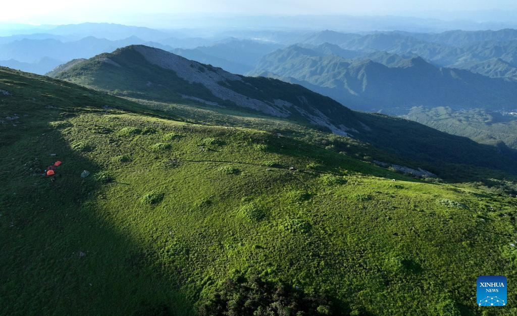 Aerial photo taken on June 28, 2022 shows tourists camping at Caolianling mountain in Luonan County of Shangluo City, northwest China's Shaanxi Province. Caolianling, 2,646 meters above sea level, is covered by lush vegetation and has obvious vertical distribution of plants. (Xinhua/Tao Ming)