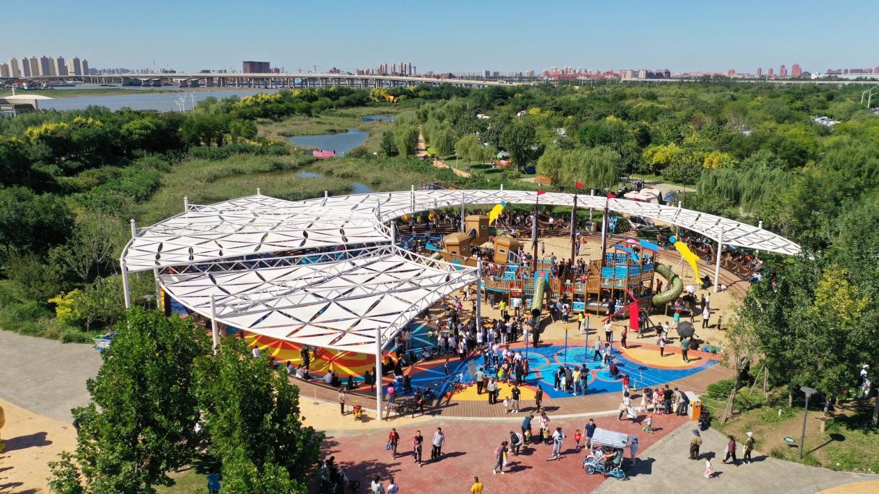 Dongjiang Park is a remarkable outcome of a comprehensive treatment campaign for the Bohai Sea launched by north China's Tianjin municipality. Wetlands and ecosystem along the coastline in the park have been restored. Viewing platforms, sports fields, playgrounds and other leisure and entertainment facilities have also been built there. (Photo courtesy of the convergence media center of Tianjin's Binhai New Area)
