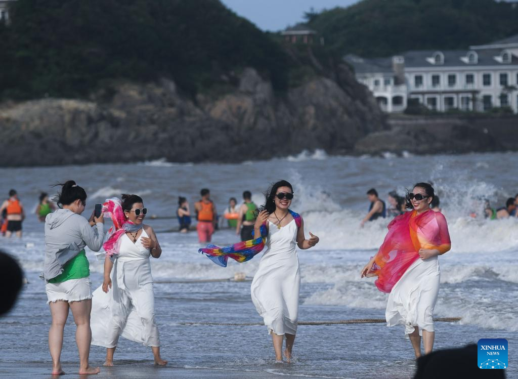 Tourists play on the beach in Zhujiajian scenic spot in Zhoushan, east China's Zhejiang Province, June 28, 2022. The Zhujiajian scenic spot saw a steady recovery of tourism this summer. (Xinhua/Xu Yu)