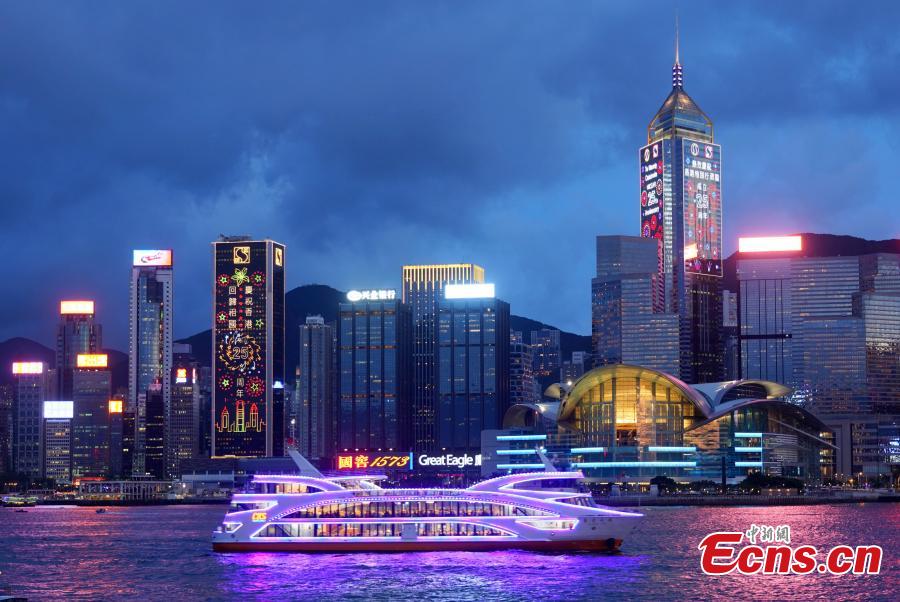 Light installations are illuminated to celebrate the 25th anniversary of Hong Kong's return to the motherland at the Victoria Harbor, the Hong Kong Special Administrative Region, June 29, 2022. (Photo: China News Service/Zhang Wei )