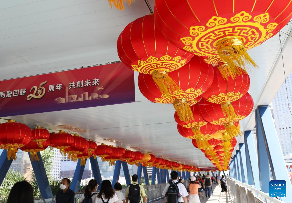 Lanterns are hung up along a promenade in Hong Kong, south China, June 28, 2022. July 1 this year marks the 25th anniversary of Hong Kong's return to the motherland. (Xinhua/Li Gang)