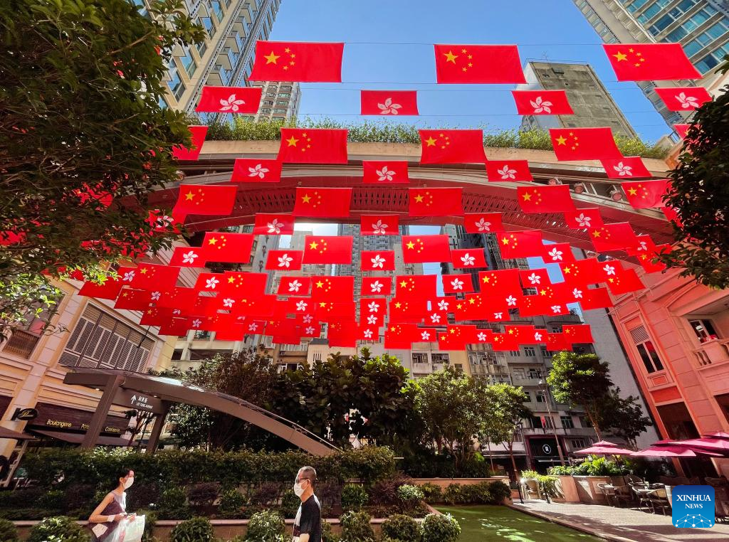 China's national flags and the Hong Kong Special Administrative Region (HKSAR) flags fly along a street in Hong Kong, south China, June 29, 2022. July 1 this year marks the 25th anniversary of Hong Kong's return to the motherland. (Xinhua/Lo Ping Fai)