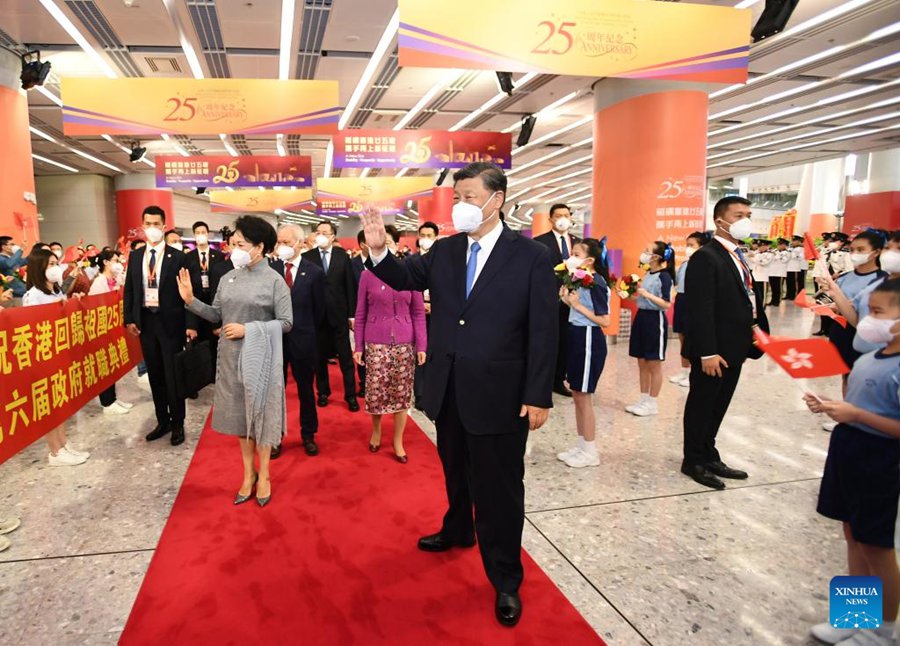 Chinese President Xi Jinping congratulates the Hong Kong compatriots and extends his best wishes on the occasion marking the 25th anniversary of Hong Kong's return to the motherland upon his arrival in Hong Kong, south China, June 30, 2022. Xi, also general secretary of the Communist Party of China Central Committee and chairman of the Central Military Commission, arrived in Hong Kong by train on Thursday afternoon. Xi will attend a meeting celebrating the 25th anniversary of Hong Kong's return to the motherland and the inaugural ceremony of the sixth-term government of the Hong Kong Special Administrative Region (HKSAR) on July 1. He will also inspect the HKSAR. (Xinhua/Yue Yuewei)
