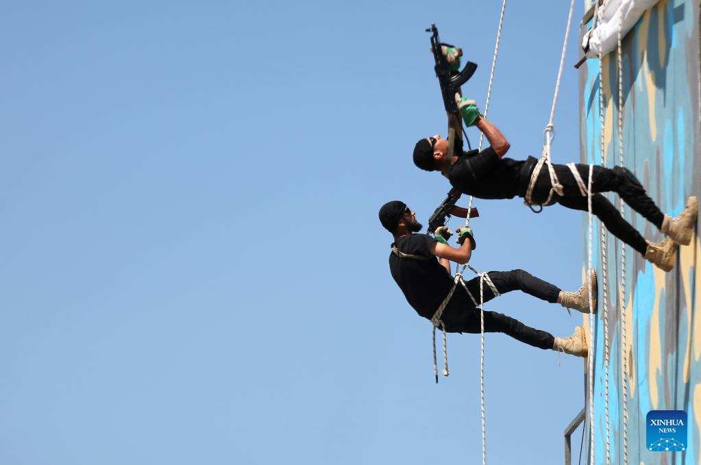 Members of the Palestinian Hamas security forces show their skills as they take part in a military graduation ceremony in the southern Gaza Strip city of Khan Younis, on June 30, 2022. (Photo by Yasser Qudih/Xinhua)