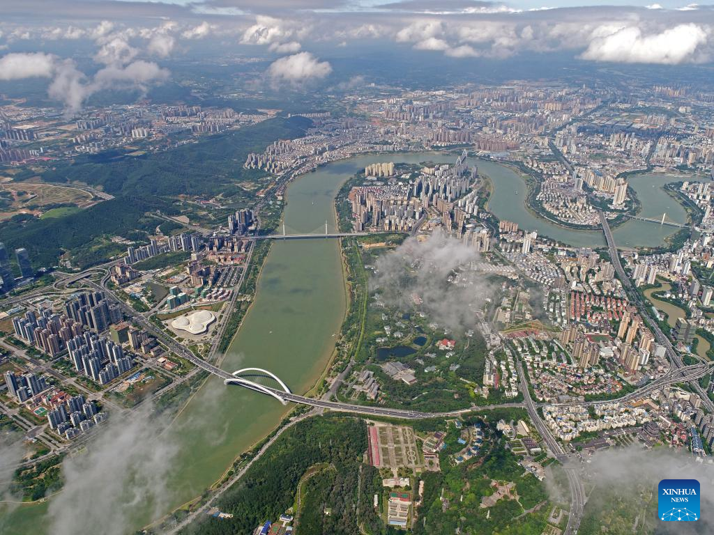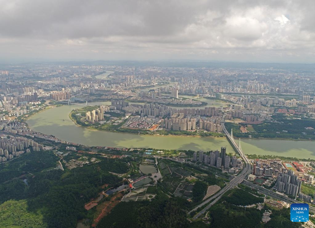 Aerial photo taken on July 1, 2022 shows the scenery of Yongjiang River in Nanning, south China's Guangxi Zhuang Autonomous Region. (Xinhua/Zhou Hua)