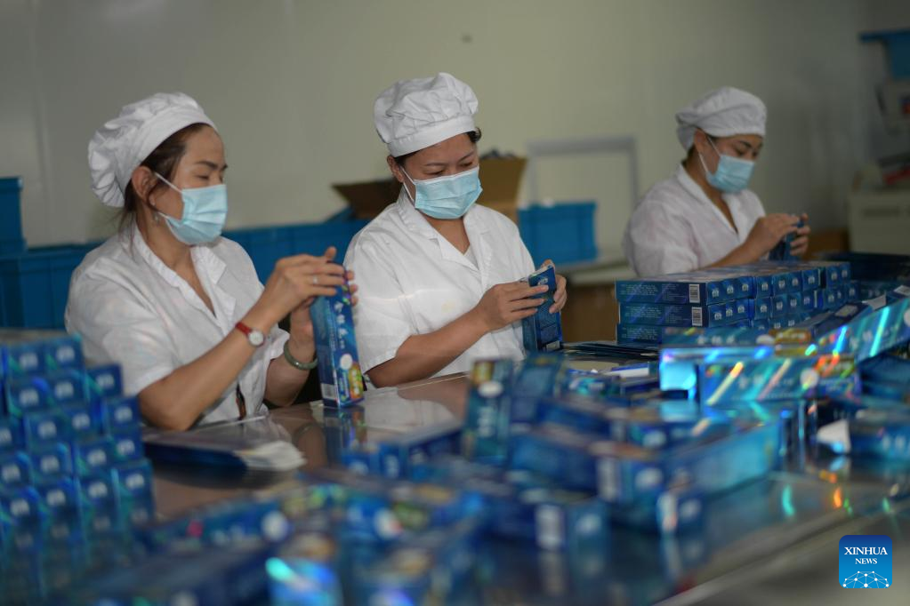 Workers pack toothpaste made from honeysuckle at a plant in Suiyang County, southwest China's Guizhou Province, July 1, 2022. The local government has been making efforts in developing industries related with honeysuckle, which has entered its harvest season lately. (Xinhua/Yang Ying)