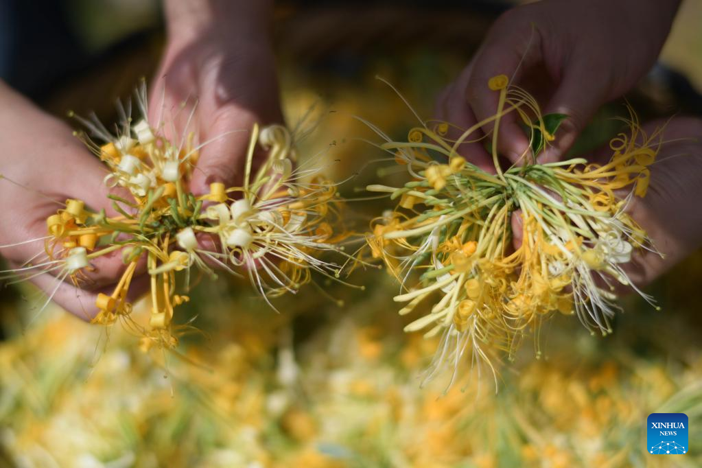 Local people harvest honeysuckle at a plantation base in Suiyang County, southwest China's Guizhou Province, July 1, 2022. The local government has been making efforts in developing industries related with honeysuckle, which has entered its harvest season lately. (Xinhua/Yang Ying)