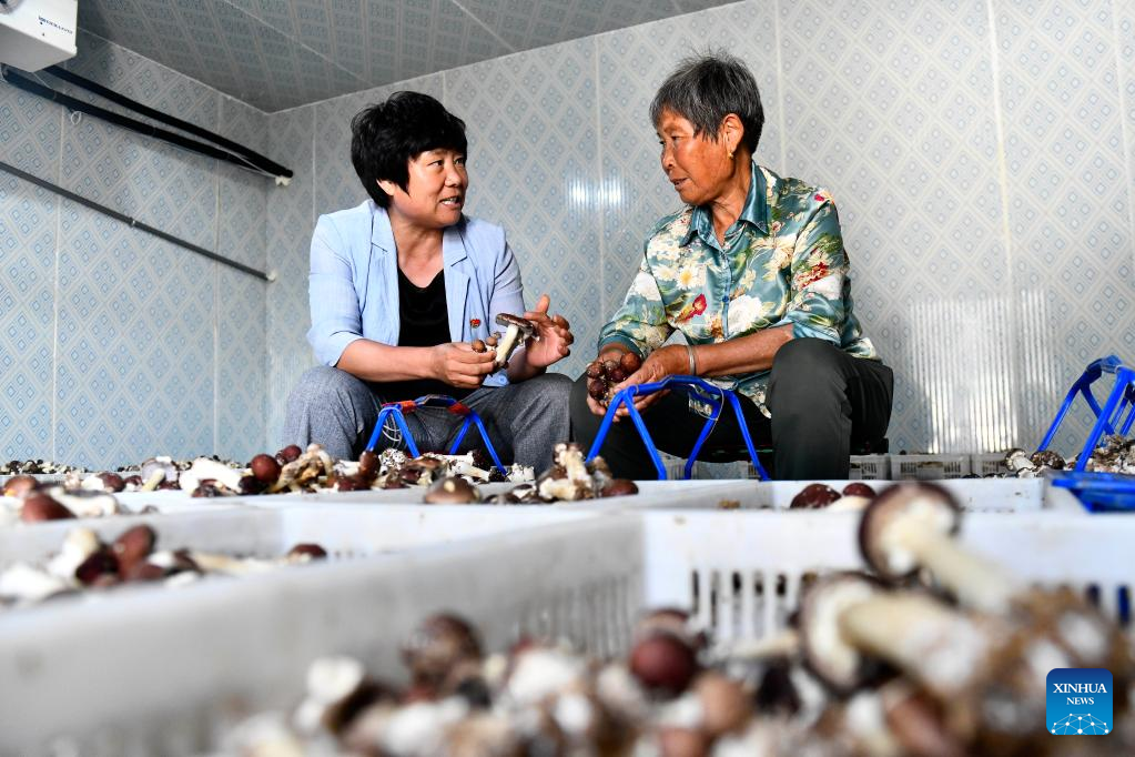 Zhang Shouying (L) tells a villager about the preservation of edible fungi at a greenhouse in Hongniya Village in Wulian County of Rizhao, east China's Shandong Province, June 17, 2022. Hongniya Village used to be a poverty-stricken village. In recent years, village cadre Zhang Shouying has taken a series of measures to help the villagers get rid of poverty and live a better life. In 2021, under the professional guidance of Shandong Agricultural University, Hongniya Village developed the cultivation of edible fungi, which has helped increase villagers' income and boost rural revitalization. (Xinhua/Guo Xulei)