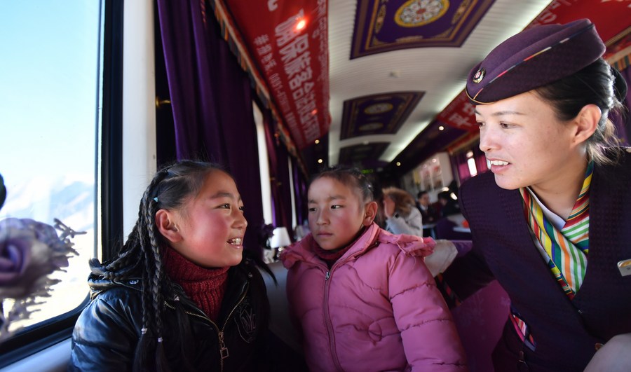 Train attendant Goin'gyi Chadron talks with passengers aboard the train of the Lhasa-Xigaze Railway in southwest China's Tibet Autonomous Region, Jan. 12, 2020. (Xinhua/Chogo)
