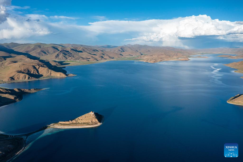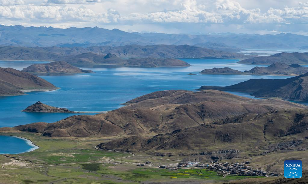 Photo taken on July 2, 2022 shows the scenery of the Yamdrok Lake in Nagarze County of Shannan City, southwest China's Tibet Autonomous Region. (Xinhua/Sun Fei)