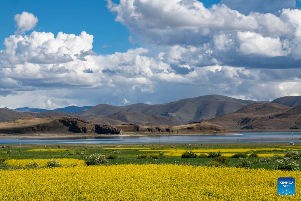 Photo taken on July 2, 2022 shows the scenery of cole flower fields near the Yamdrok Lake in Nagarze County of Shannan City, southwest China's Tibet Autonomous Region. (Xinhua/Sun Fei)