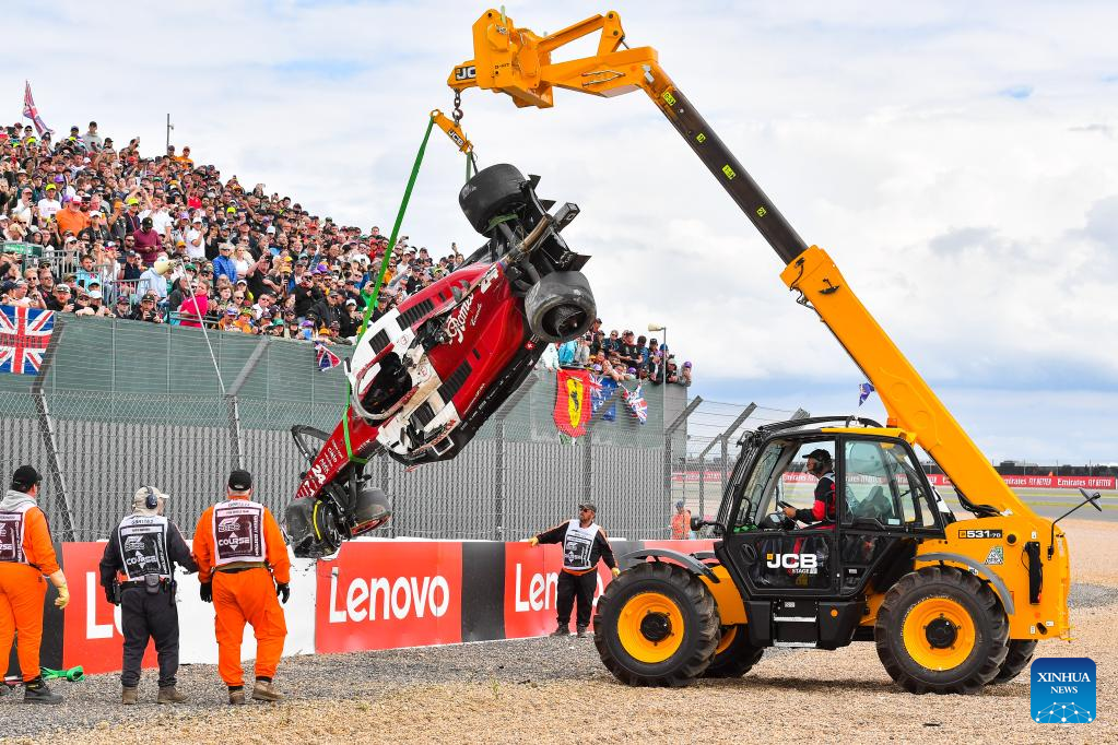 Stewards remove the crashed car of Alfa Romeo's Chinese driver Zhou Guanyu from the barriers after a crash at the start of the Formula One British Grand Prix at the Silverstone motor racing circuit in Silverstone, Britain, on July 3, 2022. (Photo by Qian Jun/Xinhua)