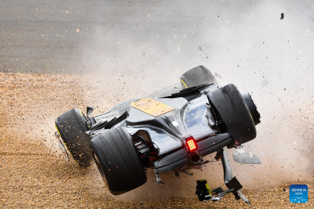 Alfa Romeo's Chinese driver Zhou Guanyu crashes out at the start of the Formula One British Grand Prix at the Silverstone motor racing circuit in Silverstone, Britain, on July 3, 2022. (Photo by Qian Jun/Xinhua)