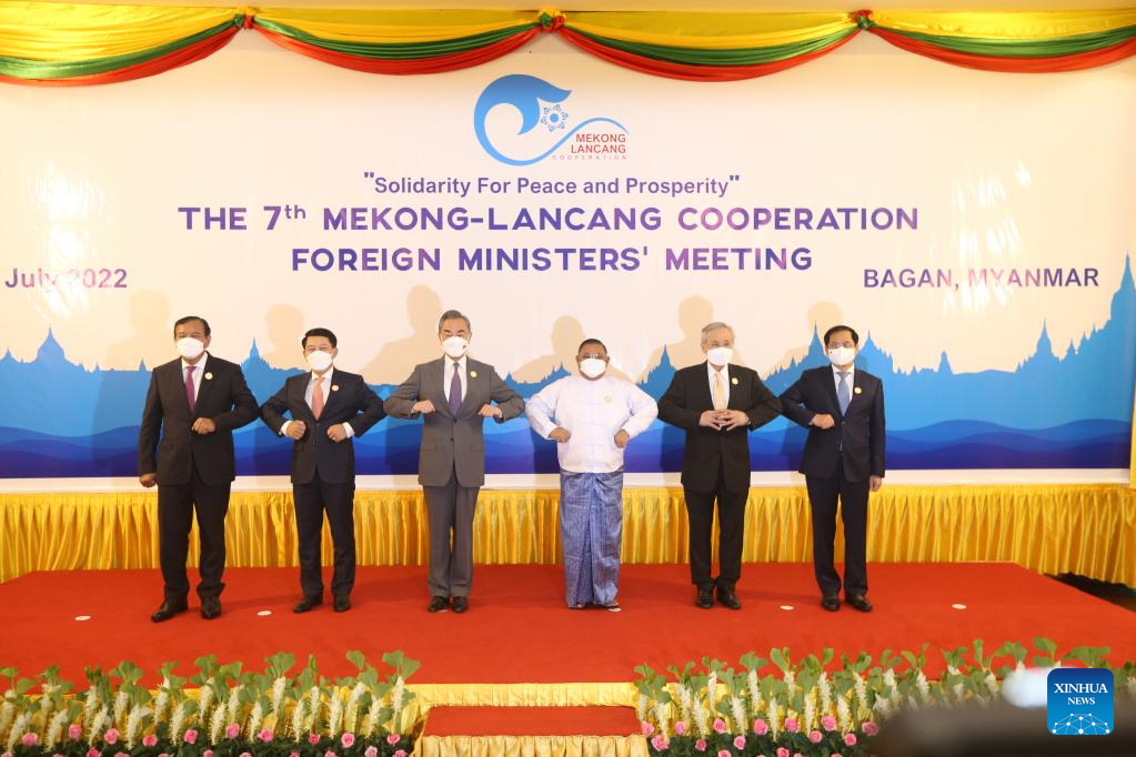 Chinese State Councilor and Foreign Minister Wang Yi, Myanmar's Foreign Minister U Wunna Maung Lwin, Lao Vice Premier and Foreign Minister Saleumxay Kommasith, Cambodian Deputy Prime Minister and Foreign Minister Prak Sokhonn, Thai Deputy Prime Minister and Foreign Minister Don Pramudwinai and Vietnamese Foreign Minister Bui Thanh Son attend the seventh Lancang-Mekong Cooperation (LMC) Foreign Ministers' Meeting in Bagan, Myanmar, July 4, 2022. (Xinhua/Zhang Dongqiang)