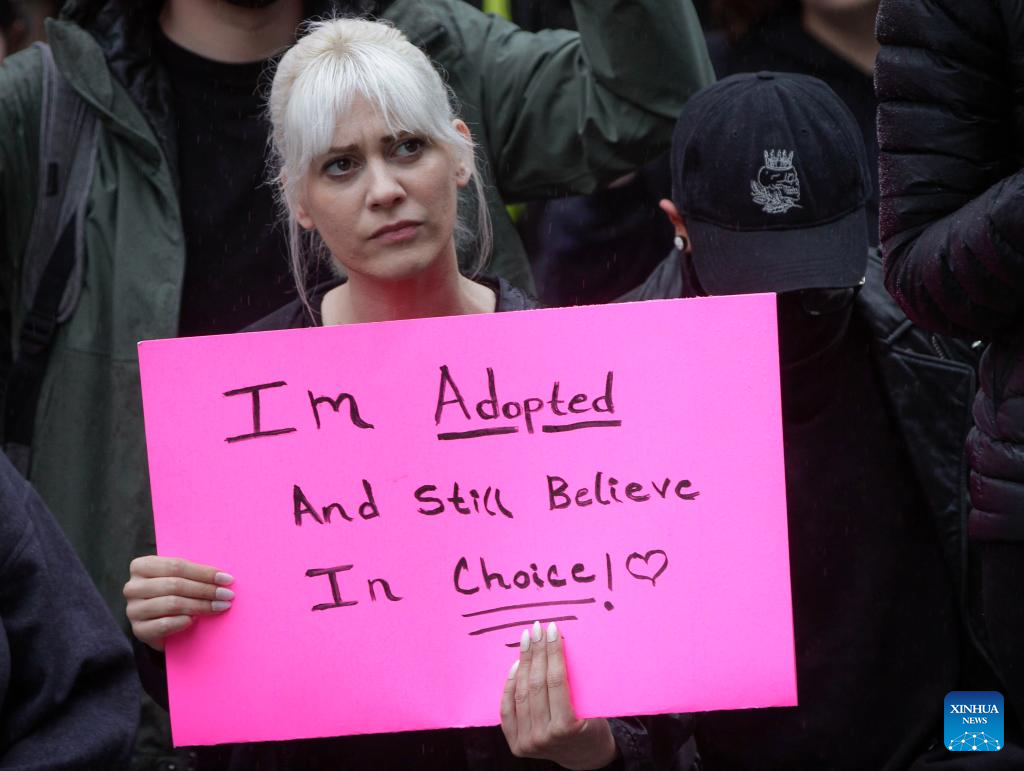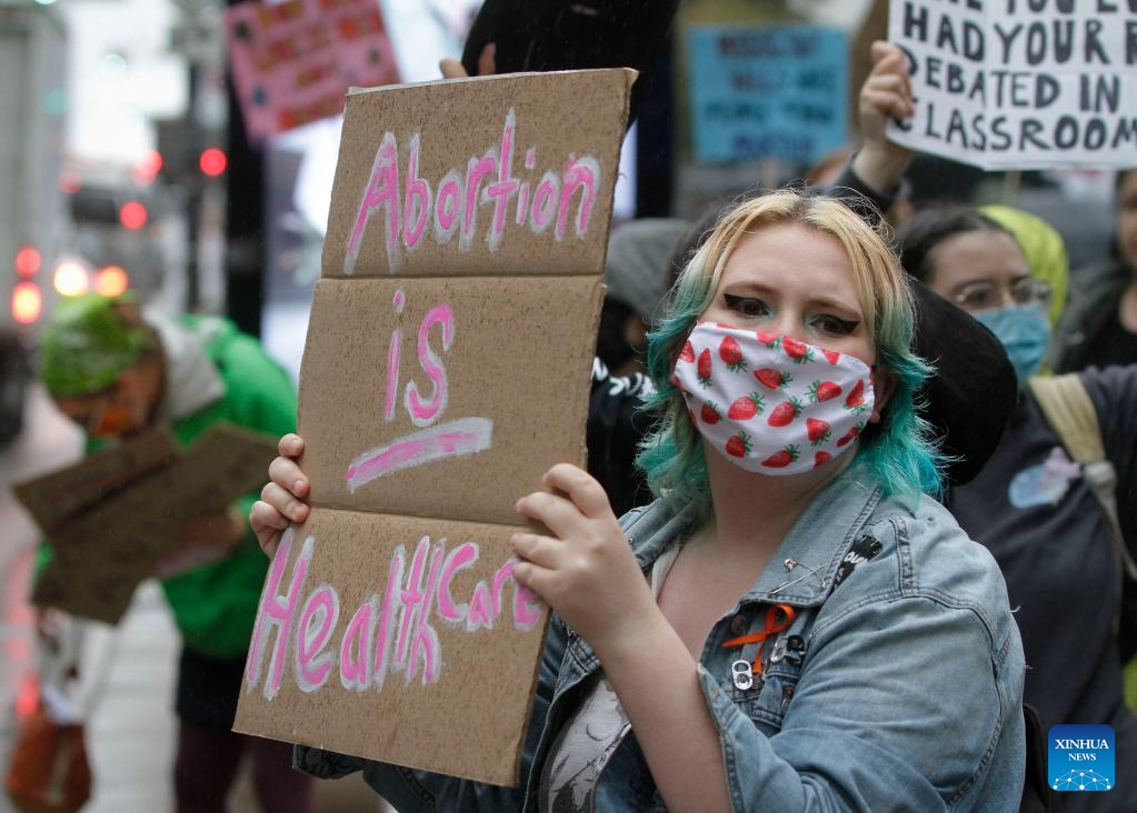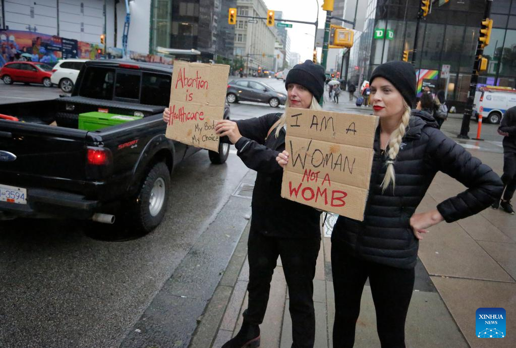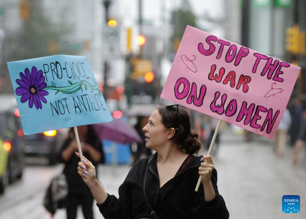 People participate in an abortion rights rally outside Vancouver Art Gallery in Vancouver, British Columbia, Canada, on July 4, 2022. (Photo by Liang Sen/Xinhua)